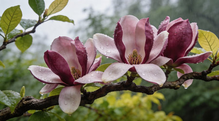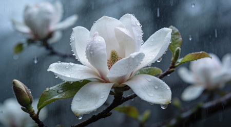 A creative digital illustration depicting Rain-kissed magnolia blossoms on branch against fresh greenery, vertical portrait composition, overcast natural lighting, elegant botanical style, peaceful renewal mood, high-detail stock image.. This AI-generated artwork features unique visual elements suitable for various commercial and editorial applications. AI-generated illustration.