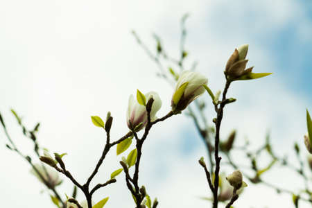 Beautiful blooming magnolia branches with open flowers. White chinese magnolia with tulip flowers in spring garden. Botanical Garden in May.