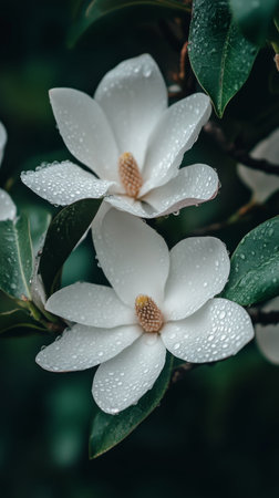 Close-up of dewy magnolia flowers against green foliage