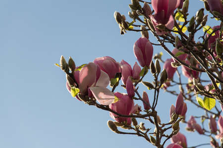 Blossoming of magnolia flowers in spring time against bright blue sky