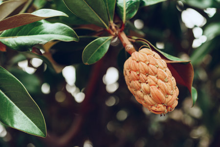 Seed and fruit of a magnolia tree with green leaves background