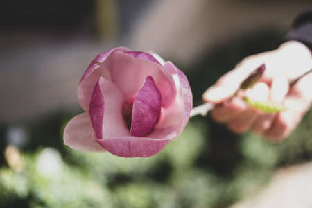 Blooming flower of magnolia in the hand