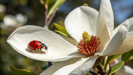 Ladybug on a white magnolia flower in the garden. Macro