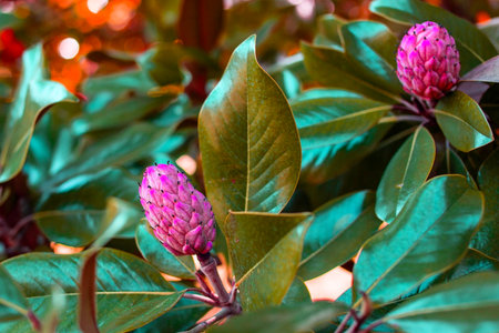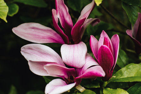 Purple flowers and green leaves of magnolia tree in the garden