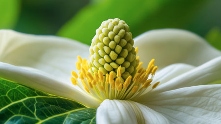 Stunning close-up image of a white flower showcasing intricate details of its green center and vibrant yellow pollen, perfect for nature-themed projects.