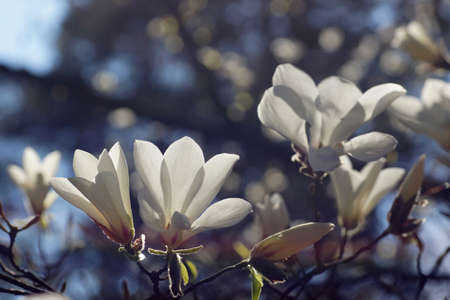 Spring in the arboretum, white magnolia flowers, close-up, fuzzy background and blank space