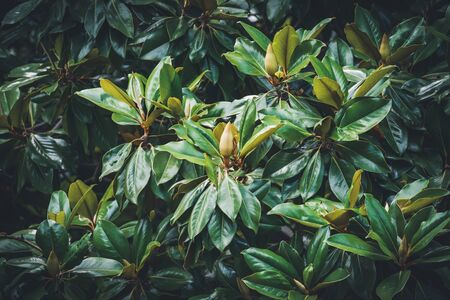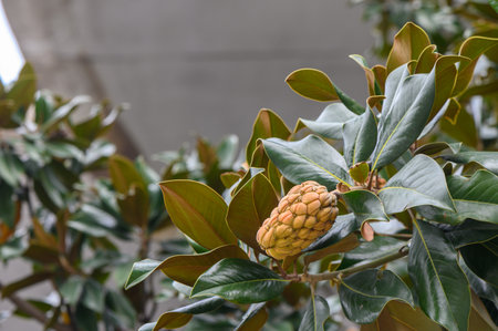 Magnolia cones. Fruits of the magnolia tree. Dense leaves. Background from foliage.