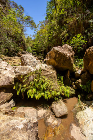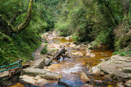 Wooden bridge over creek and trail through forest at the Aparados da Serra National Park near Cambara do Sul. A small country town in southern Brazil with amazing natural tourist attractions.