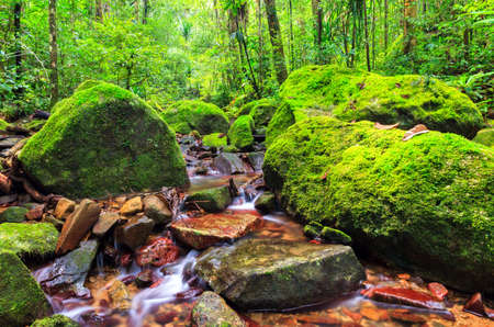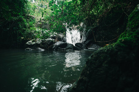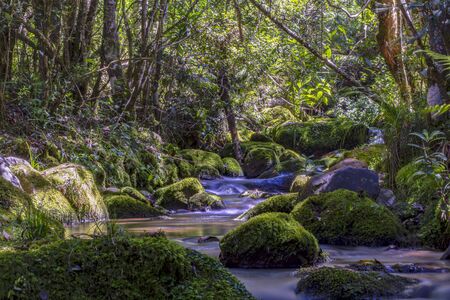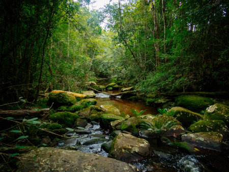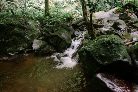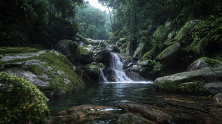 Serene stream flowing through a lush rainforest. Mossy rocks and tropical plants create a tranquil scene of natural beauty.