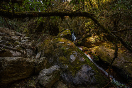 Multiple exposure of different spots of a ravine with rocks covered in moss at the highlands of Iguaque, at the center of the Colombian Andes.