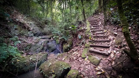 amazing pathway in the woods, besides a small stream of water. Stairs curved going to the sun. Brazilian forest