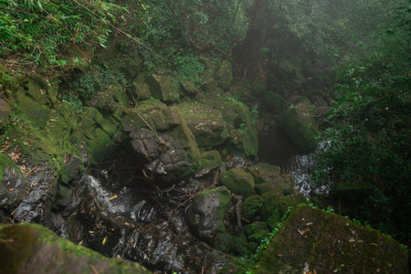 Forest landscape with rocky gorge with green moss and tropical vegetation. Wet rainforest nature background