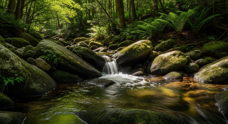 A gentle woodland creek winds past emerald foliage, gliding over vibrant moss-covered stones, creating a calming scene of natural serenity and lush vitality.