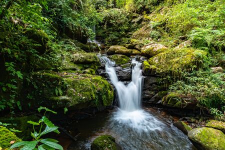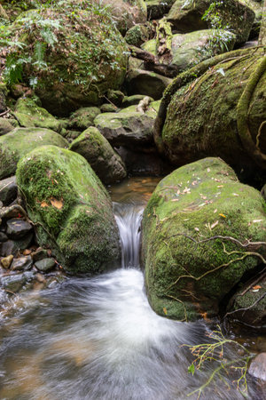 The River Da Gou Xi cascades over mossy rocks through forest in Da Gou Xi water Park in Taipei,Taiwan