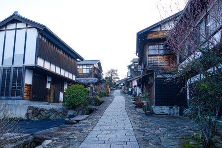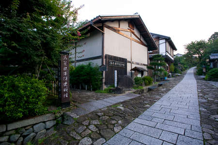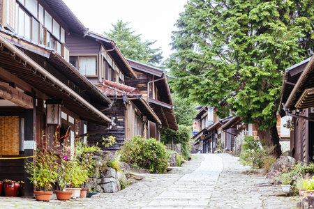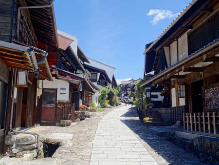 Nagano, Japan - April 20, 2019 : View of shop in Narai Post town (Narai-Juku) Japan Old wooden house and narrow street in Kiso Valley of Nagano Japan.