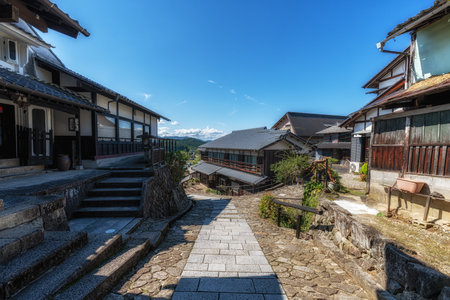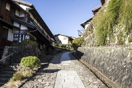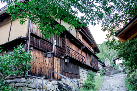 Streets and traditional Japanese houses at Magome Juku town along the Nakasendo trail in Kiso Valley, Japan.