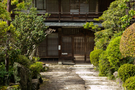 Tsumago, Nagano, Japan - 31st July 2018 : Close up picture of a Japanese written wooden board hanging from a typical house of Tsumago-Juku, on the famous Nakasendo road trail in Japan