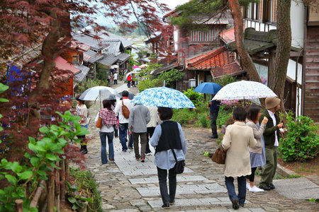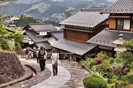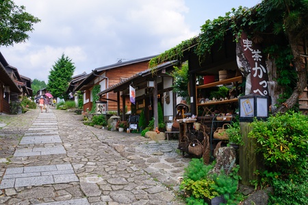 MAGOME, JAPAN - MAY 2, 2012: People visit old town of Magome. Magome-juku was a historic post town of famous Nakasendo trail between Kyoto and Edo.