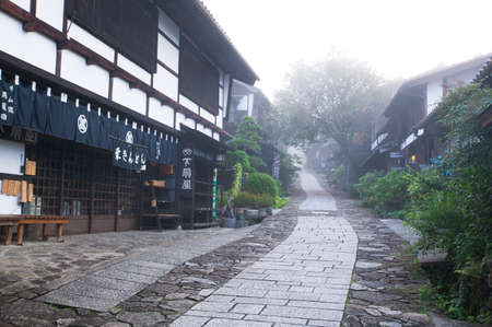 Nakasendo Magome-juku (Nakatsugawa City, Gifu Prefecture) in the early morning with old private houses on the slope