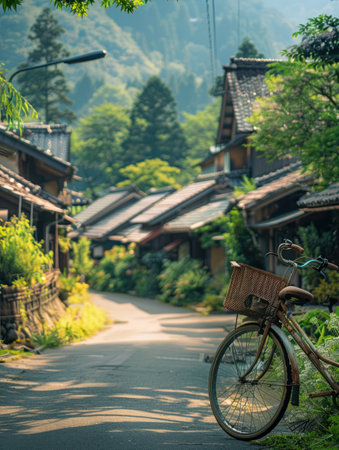 Rural village scene with rustic houses, bicycle parked on side of road. Houses blend into green surroundings, clear blue sky above. Perfect for travel agency and tours.
