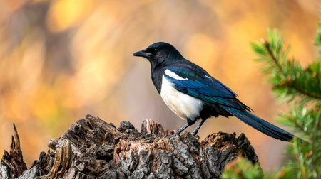 Magpie bird sitting on a branch in the autumn forest at sunset
