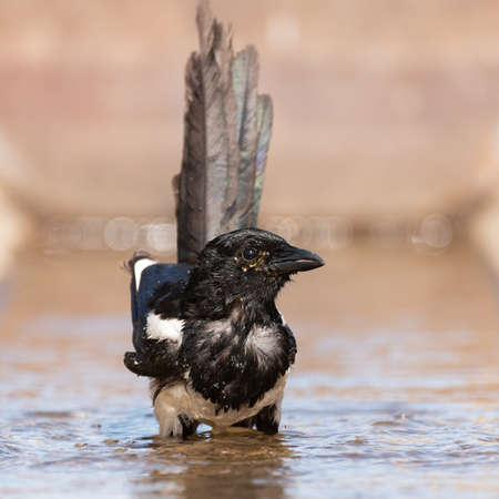The Eurasian Magpie or Common Magpie (Pica pica) on the ground in spring