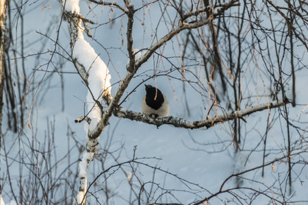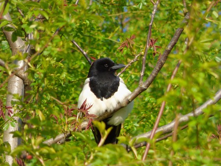 The Eurasian Magpie or Common Magpie or Pica pica is sitting on the branch with colorful background. Bird watching in early spring in March.