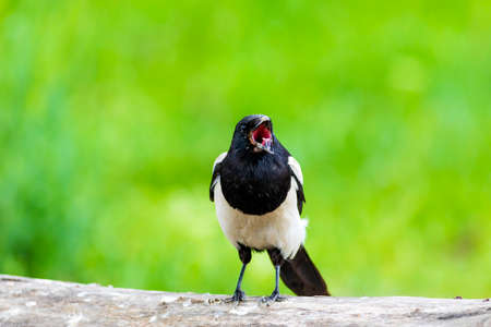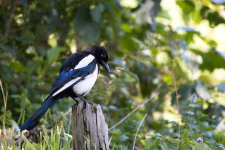 A magpie bird sitting on a tree stump in The Netherlands during summer. Magpie. Schiedam.