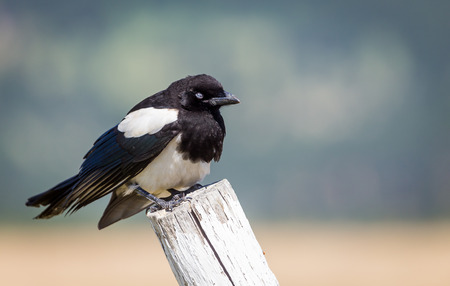 Eurasian Magpie or Common Magpie (Pica pica) on a fence post. Gelderland in the Netherlands. Bokeh background.