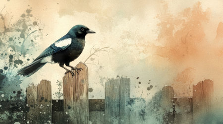 Watercolor illustration of magpie perched on wooden fence with abstract background. Concept of nature, wildlife, artistic bird depiction, watercolor painting. Copy space.