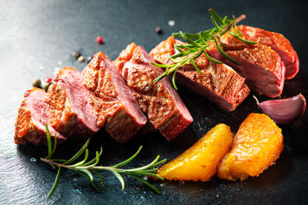 Close up of sliced roasted duck breast fillet garnished with rosemary and spices on slate