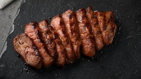 Floating slices of grilled beef steak with a touch of fresh herbs and seasoning create a captivating culinary visual for gourmet delights. Perfect for food enthusiasts!
