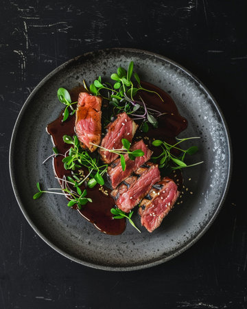 Indulge in a gourmet meal featuring tender beef slices on a rich risotto, adorned with vibrant microgreens. Perfect for culinary enthusiasts and food photography.