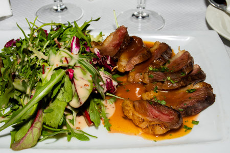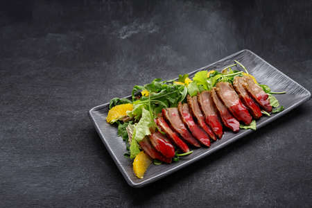 Traditional duck fillet, rare done, served with salad in a french restaurant. Original authentic recipe, orange sauce dressing on top