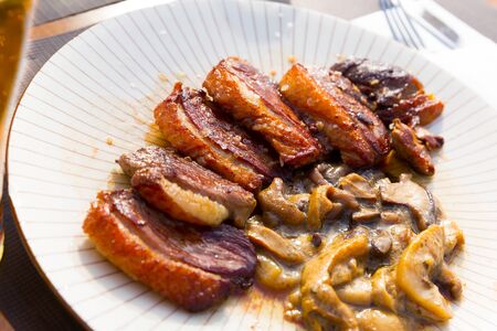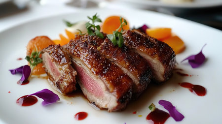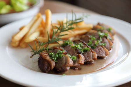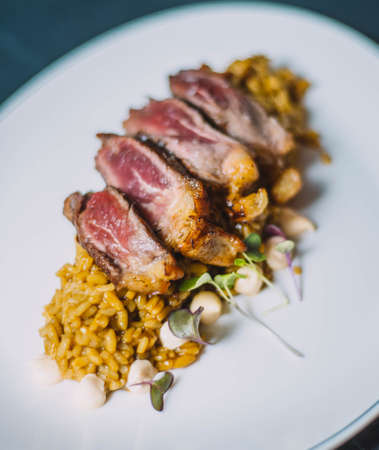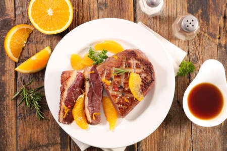 Appetizing duck breast with orange sauce. Duck breast beautifuly served on plate close up. Delicious dinner at restaurant.