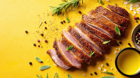 Tender slices of roast duck lay on a bright yellow background, decorated with fresh herbs and scattered spices, showing a delicious meal ready to savor.