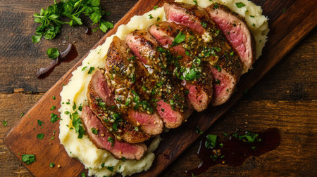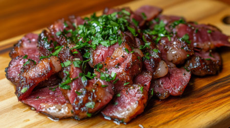 A mouthwatering display of grilled meat garnished with fresh herbs, beautifully presented on a wooden cutting board, perfect for culinary enthusiasts and food photography projects.