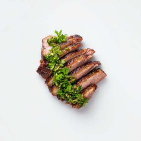 A beautifully grilled steak sliced and garnished with fresh green herbs, presented on a minimal white background. Ideal for culinary and food photography.