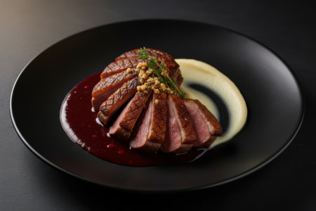 Roasted duck breast slices with a red berry sauce and a creamy pur