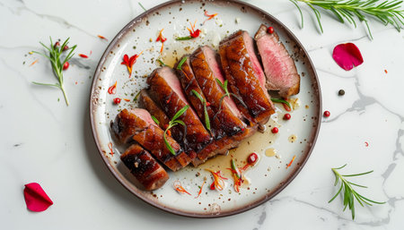 Exquisite display of succulent roast duck slices on a pristine white dining table