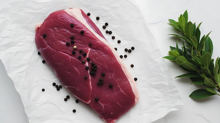 The a raw beef steak placed on a piece of parchment paper. The steak is generously sprinkled with black peppercorns, adding a rustic and appetizing touch. To the right of the steak, there are fresh green bay leaves, enhancing the natural and fresh appeal of the scene. The background is a plain white surface, which highlights the vibrant colors of the meat and herbs. The overall composition suggests a preparation stage for cooking, emphasizing freshness and simplicity in culinary practices.