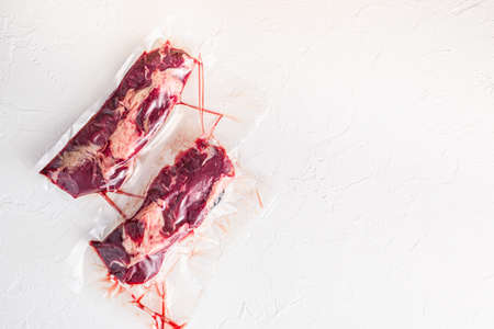 Pair of chuck roll beef steak, vacuum packed organic meat for sous vide cooking on white concrete textured background, top view space for text