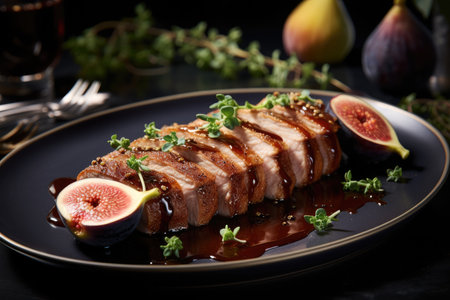 Roasted Christmas duck breast fillet steak. Black background. Top view. Copy space
