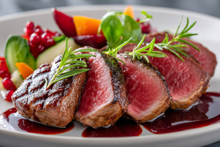 Duck breast slices with vibrant vegetables, red currant, and rosemary