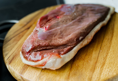 Top view of smoked duck breast fillet sliced in white plate on wooden table in Chinese restaurant, Sliced peking duck for eating or serve, Space for your text