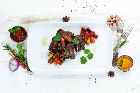 Baked pork ribs with vegetables. In the plate. On a wooden background. Top view. Free space for your text.