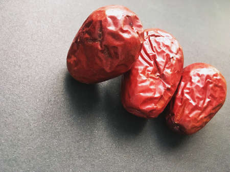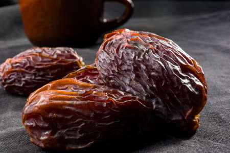 Big luxury dried date fruit on the dark surface, kurma ramadan kareem concept.