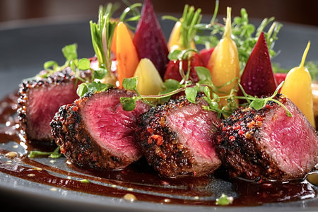 A beautifully plated gourmet dish featuring tender beef accompanied by vibrant garnishes and a rich sauce, perfect for upscale dining experiences.