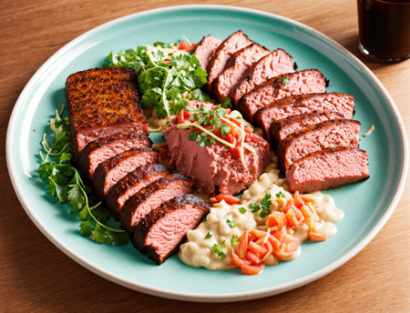 AI Generated. A plate of grilled meat with herbs on top
