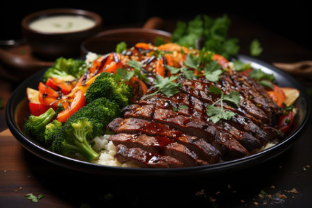 AI Generated. Grilled beef steak slices with fresh salad served on a plate